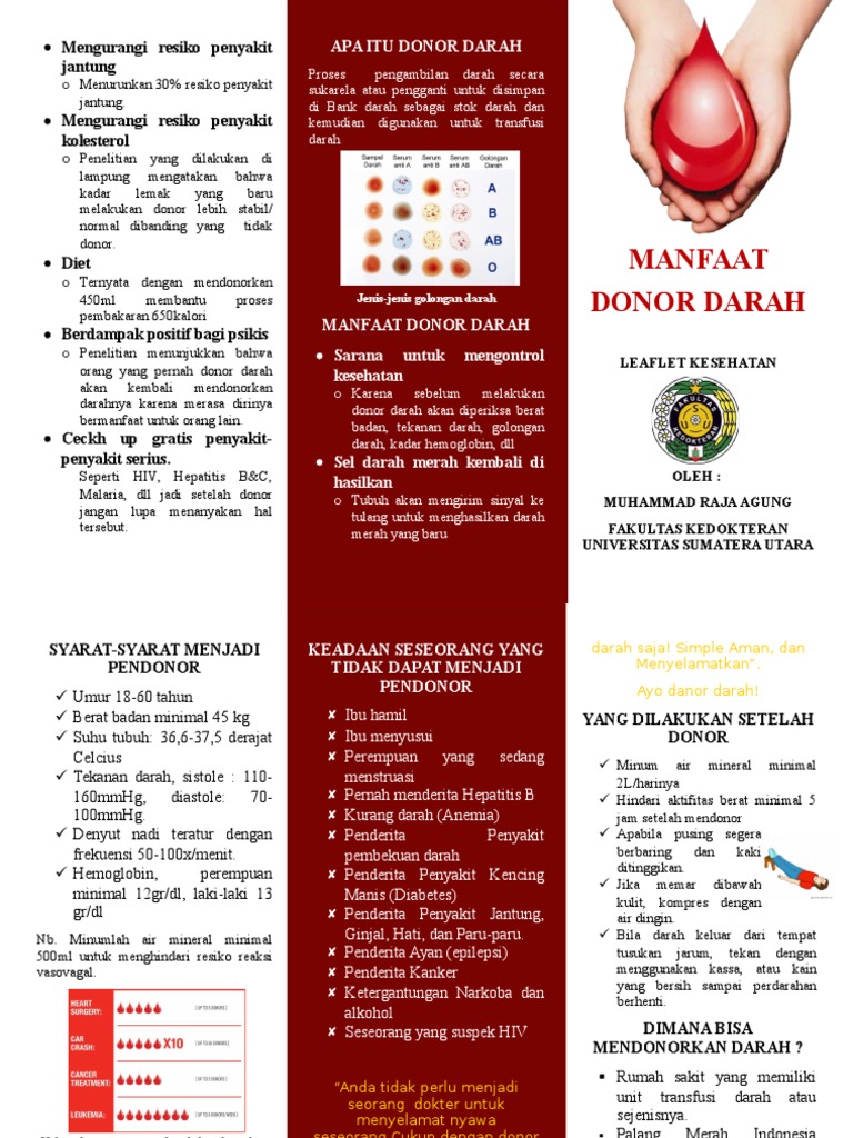 Donor darah nyatanya tak hanya bermanfaat bagi sang penerima (resipien) semata. Seseorang yg menyumbangkandarahnya secara sukarela tanpa. Sebenarnya penggunaan pamflet ini sudah digunakan sejak lama. Maka saya tambahkan kotak merah dibagian bawah kalimat datang donasikan darahmu. Donor darah sangat penting namun seringkali terlupakan.